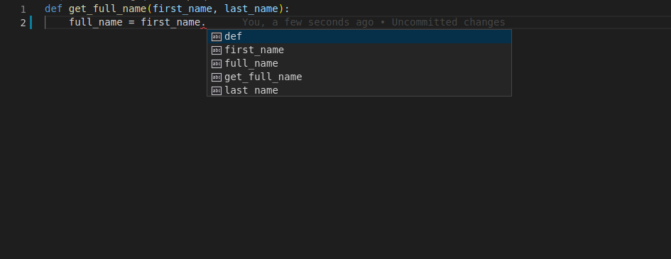 Bạn gõ tham số đầu tiên của hàm, first_name, sau đó một dấu chấm (.) và sau đó ấn Ctrl+Space để kích hoạt bộ hoàn thành.