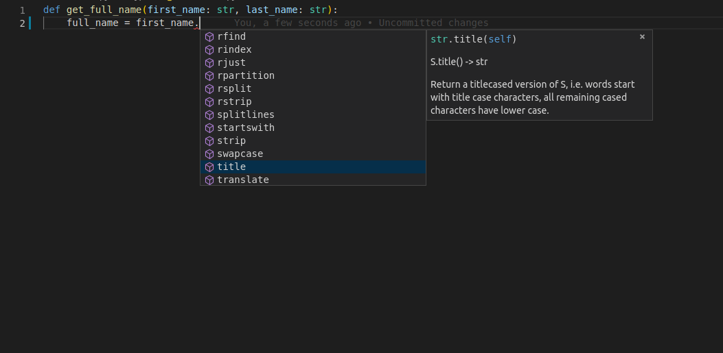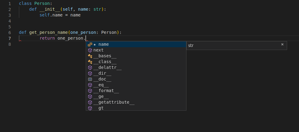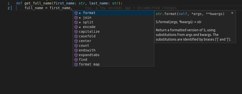 Và do vậy, trình soạn thảo biết nó là một str, và cung cấp sự hỗ trợ cho nó.